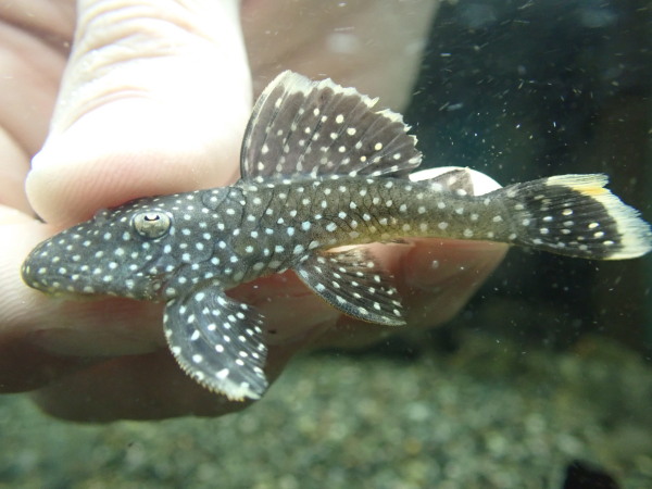 高くないし見た目キレイだしで人気のオレンジフィンカイザープレコです。細かいスポットとヒレの縁のオレンジがキレイですね!ちょっと値段上がりますが12cm位の大きい個体も1匹在庫いますのでお好きなサイズをどうぞ!中段左の画像です。