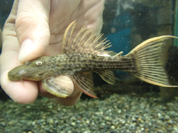 ヒゲもじゃで妖怪みたいなプレコ。大きくて平たい頭がしゃもじみたいでキモかわいいです!今回来たの小さいですが既にヒゲもじゃなのでオスですね!中段右の画像です。
