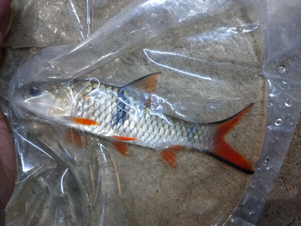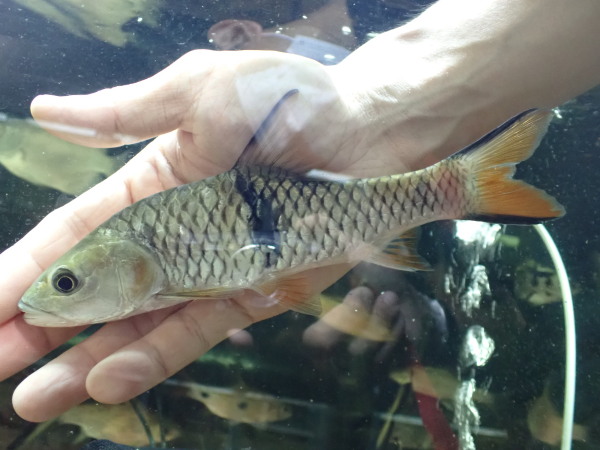 過去に国内に輸入されたことがあるのかは分かりませんが、当店では初入荷!サルウィン産のハンパラの1種で、普通のマクロレピドータよりもセンターのバンドが太く、気分によってはエラ蓋の後ろの肩の辺りにも黒いスポットが出て、尾筒にもうっすらバンドが入ります。またヒレの色もかなり濃いです。個人的にハンパラ大好きなので感動です!輸入直後でちょっとスレとかありますが治る程度ですのでご了承下さい。あとは最近全然来なくなっちゃったディスパーが来れば嬉しいんだけどな・・・。中段右、左下の画像です。水槽から出した状態の袋越しの画像で見てもらうとヒレの色の濃さがお分かりいただけるかと思います。