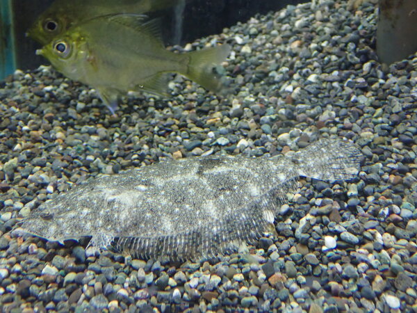 淡水ヒラメとありますがちょっと塩入った汽水です。汽水ですがそんなに神経質に塩分濃度を測ったりする必要は無く、適当に少し塩入れておけば全然大丈夫です。塩を入れてpHが下がりすぎないようにしてあげれば丈夫で、餌もバクバク食べるので飼いやすいですよ!右下の画像です。