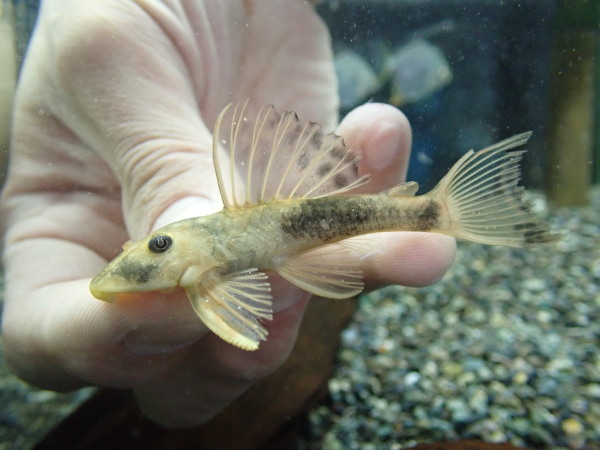 超激レア!ジャグアリベンシス入荷!!過去に国内に輸入されたことがあるのかは分かりませんが、当店へは初入荷です!全身が黄色くなったり、黄色のまだらになったりする不思議なヒポストムス。この黄色い表現がどれくらい安定している形質なのかが分かりませんが、すごくキレイなプレコです!ゴールデンダルマのように一気にノーマルに戻ってしまうことがあったりするのか、ゴールデンアンジェリカスのように多少黄色がくすむことがあっても元に戻るようなことは無いレベルなのか、とりあえずしばらく育ててみないと分かりませんが、現状ではキレイに黄色いまだら模様になっています。輸入元は現地からは魚の状態が良ければ成長につれて黄色くなっていくようなことを言われたみたいですが、実際のところはどうなんでしょうか?ほとんど情報の無い魚なのでネットで検索しても画像はほとんど出てきませんが、気になる方は学名の Hypostomus jaguribensis で画像検索してみてください!右下の画像です。すみません、ほんのちょっと白点付いてました。販売はトリートメントが済んでからになりますが、ご予約はOKですので気になる方はお問い合わせください。
