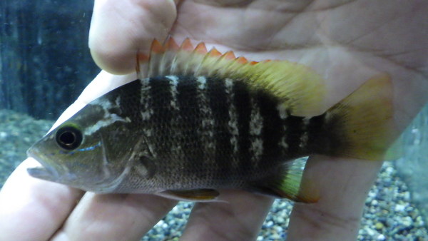 がっしりした体型のキレイなフラワートーマンです。白い水槽に入れちゃったのが失敗でした。色飛んで全然本来のキレイさが出てない・・・。青とか緑とかの発色以前に、体側にうっすら縞模様のような細かい柄や頬のラインなど模様がはっきり出そうなちょっと面白い個体です。あとで別の水槽に移してみよう。この模様がどんな感じになるかちょっと気になる。中段左の画像です。
