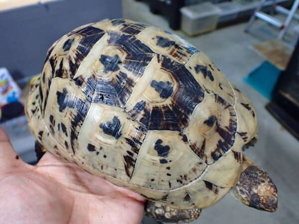 普通のキレナイカは明色部がもっと黄色っぽいんですがこの個体はかなり白っぽいです。しかもこいつは白勝ちな極美個体です!さらに甲羅もツルツルでシルエットもすごくキレイ!輸入されてから数か月ストックされていた個体なので餌食いも良く状態は良好です。右前足の一番内側の爪がありませんが、爪が欠けたとか欠損したようには見えないのでもともと1本無いんだと思います。ギリシャとかヘルマンはたまに前足の爪4本の個体いますし、全然違和感無いから個人的には全く気にならないです。キレナイカはもともと輸入量少ないですからね、ここまでの個体となるとそうはお目にかかれないのでは??これだけキレイな個体なら1匹だけでペット的に飼ってもいいですが、オスをお持ちの方はぜひ繁殖を狙っていただきたいですね!画像は全て同一個体です。