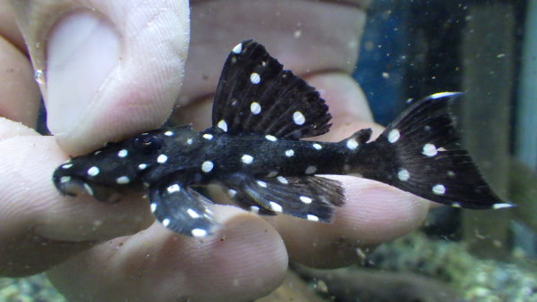 真っ黒に真っ白のスポットが入る人気のプレコです。白黒の水玉プレコで、丸みがあってかわいいのが良い方はブラックウィズホワイトカイザー、厳ついカッコいいのが良い方はブラックドラゴンスターがオススメです!今ならどっちも在庫いますよ!右下の画像です。