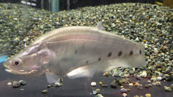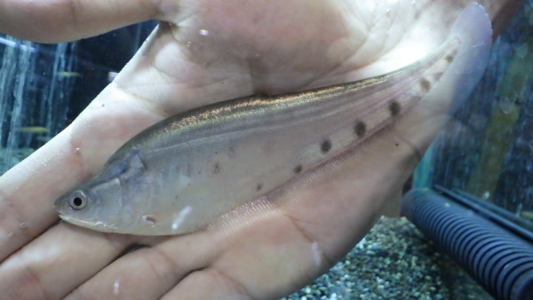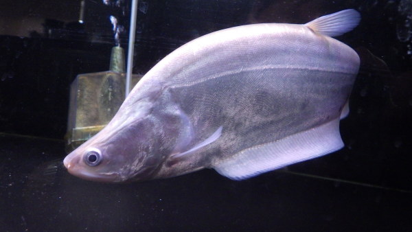 本物のプラチナ個体入荷!プラチナナイフの入荷はかなり久しぶり!当店への入荷はたぶん4~5年ぶりじゃないかな??ビカビカのプラチナシルバーの発色がすごくキレイな個体です!顔回りやヒレの付け根付近などはすでに銀色の粉を吹いたような発色をしていますし、成長するとこの粉を吹いたような色がさらに厚く発色し、体側のスポットも薄くなっていくと思います!!今でも十分キレイですが、40~50cmに成長するころには見違えるような魚に仕上がってると思いますよ!白水槽やクリアの水槽に入れて色が飛んでるだけの個体ではないことがお分かりいただけるように店頭では4面黒の水槽に入れてありますが、もちろん白水槽に入れてあげればさらに真っ白のビカビカな状態になりますよ!上段の画像です。2つの画像は同一個体です。