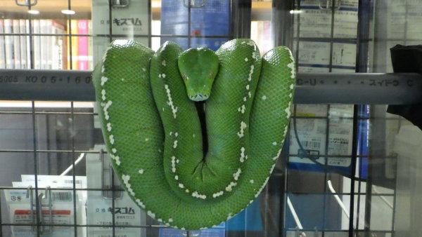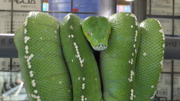 背中のホワイトスポットがほぼつながった極美個体です。アルーでこの表現は珍しいと思います。CBなので餌食いも良好でピンセットから冷凍マウスOKです!枝からはがす時だけ気を付ければ、一度持ってしまえばハンドリングも可能です。ただしあまりこの種類は信用できないことと、ヘビのストレスになるのでハンドリングはオススメはしません。状態良好で餌食い抜群で超キレイなグリーンパイソンですよ!上段、中段左の画像です。3つの画像は同一個体です。
