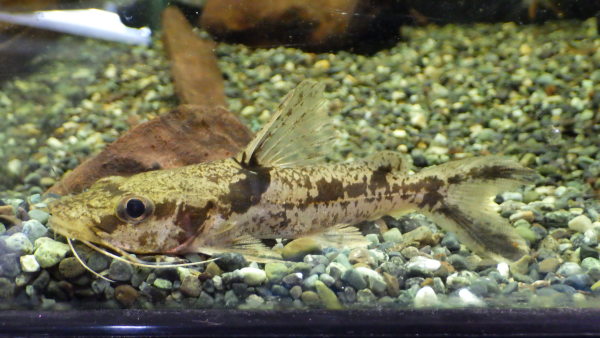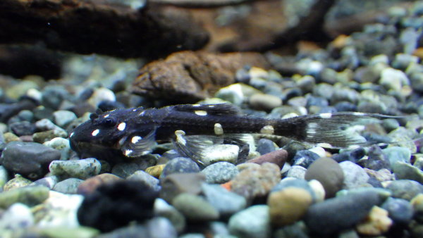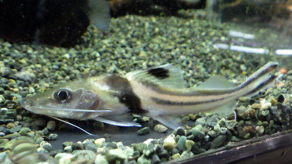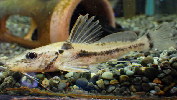 南米のマウスフィンキャットにそっくりですが、こっちはアフリカ産のギギ科の1種。本当にそっくり。ギギ科の特徴でもある上アゴのヒゲの形状や脂ビレの形を見れば区別は容易ですが、そういう判別点を知らない人が見たら同じ魚に見えるでしょうね。この類似は魚類における収斂進化の1例と考えられますが、遠く離れた地域に生息する全く類縁のない種類が外見上そっくりに進化をするなんて不思議ですね。南米マウスフィンとアフリカンマウスフィン、セットで飼育してそんな収斂進化の神秘を感じてみませんか!?右下の画像です。