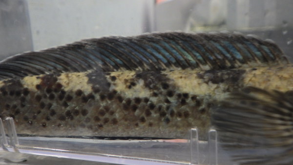 初めて聞く名前でしたが、スチュワート系のスネークヘッドでした。そんなに密にではないですが体側にはっきりした黒いスポットが出ていてブラックダイヤモンドのしょぼいヤツみたいな感じです。っていうかもしかしたら本当にブラックダイヤモンドの黒いスポットの少ないやつかもしれません。実際そういう個体も今までたくさん輸入されてますし、体側が真っ黒になるほどスポットが出てる個体の方が少ないですからね。もしスポット少ないブラックダイヤモンドならこの個体まだ小さいしこれから化けるかも!?この値段で大化けしたら超ラッキーですね!中段の画像です。2つの画像は同一個体です。