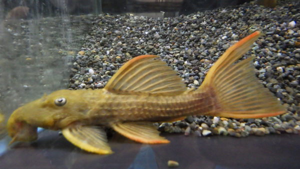 チョコレートブラウンの体にオレンジのスポットがキレイなプレコ。尾ビレの上下もピンと伸びてくるのでシルエットもかなりカッコいいです!個人的にも好きな種類なのでオススメです!。右上の画像です。