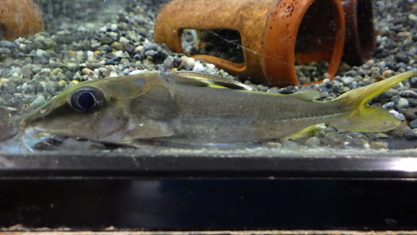 いつも売れないのにまた仕入れちゃった・・・。ずっと泳いでるから飼っていて面白いし、青い体色もキレイだし、個人的には良い魚だと思うのでもっと人気があってもいいような気もしますが、やはり他種との混泳ができないのがネックなのか・・・。大きいサイズが流通することがないので小さいのしか見たことが無い方がほとんどだと思いますが、トイレットペーパーの芯位の大きさになるんですが、そういうサイズの個体は姉金サイズの金魚でも1口2口で食べちゃったりで、そんな姿はやはりモンスターフィッシュなんだなと実感させられたり。まぁ普通に人工飼料バクバク食べるから実際はあまり生き餌あげる機会も無いんですけどね。エキノドルスと流木でシンプルにレイアウトした1800位の水槽でブルーカンディルだけを群れで泳がせるのが昔から夢だったりするんですけどね、いざ空いている1800の水槽があったとしてもそんな贅沢な使い方はできないんだよなぁ・・・。左下の画像です。ずっと泳ぎ回ってるのでキレイな画像が撮れなくてすいません・・・。