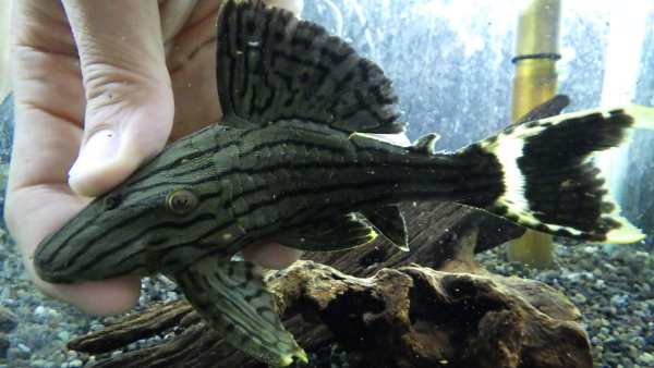 久しぶりの入荷!尾ビレの先、白いフィラメントが長く伸びたキレイな個体です!サイズもフィラメント抜きで20cmありますのでなかなかのボリューム!最近入荷少ないのでパナクェマニアの方いかがですか?すごくカッコいいプレコなので超オススメです!上段の画像です。2つの画像は同一個体です。頭には細かい棘が生えていて、それが光の具合でシルバーに光るんですが、それがすごいキレイです!