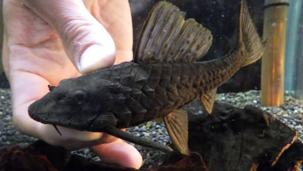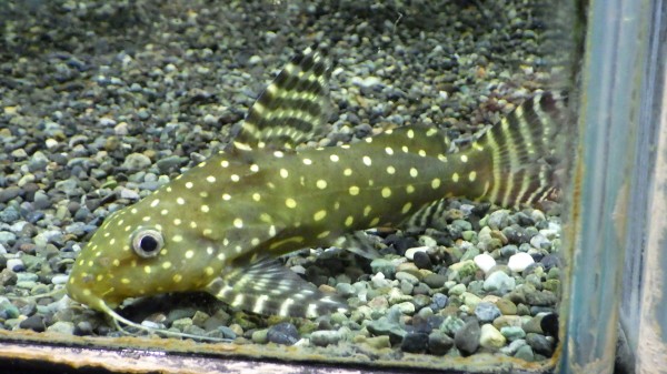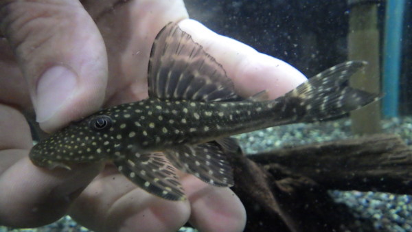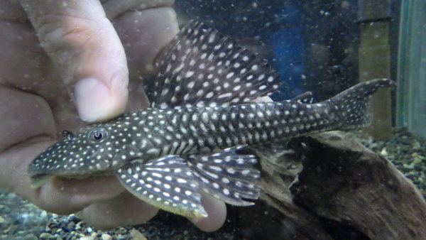 初めて見るアンジェリカスプレコです。普通のアンジェリカスよりもやや扁平な体型で、全身にホワイトスポットがびっしりです!背ビレも大きくてカッコいいですよ!右上の画像です。