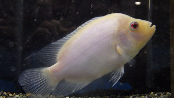 フラワーホーンがもう1匹。こいつはコブがあんまり出ていないのでメスかもしれませんね。体色は全身白一色!真っ白のフラワーホーンです!コブが出てないのがちょっと残念ですが全身真っ白で一切模様が無い個体は初めて見ました!値段は安いですがかなり珍しいと思います!同時に入荷した個体とペアなのかも??右下の画像です。