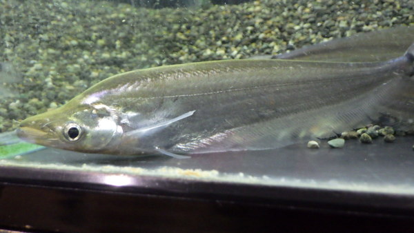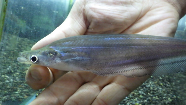 コモンシートに似たミャンマー産の激レアナマズ。見た目はよく似ていますが、比べれば違いは一目瞭然!!体色はあまり青くなく、ビカビカの銀色です!あと体高もこっちの方がちょっと高め。普通のコモンシートはこの位のサイズだと体表にちょっと透明感があって光の加減で青く光るような感じですが、このミャンマーのやつはアルミホイルを貼ったようなビカビカした体色をしています!変わったコモンシートみたいな感じでマニアな方にオススメです!入荷は1匹のみ!!中段の画像です。2つの画像は同一個体です。下段の普通のコモンシートと見比べてみてください!
