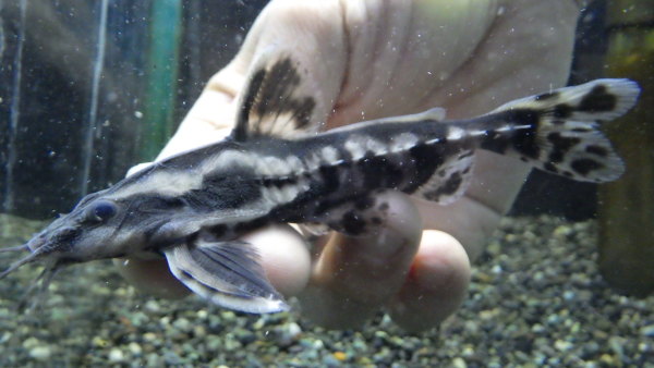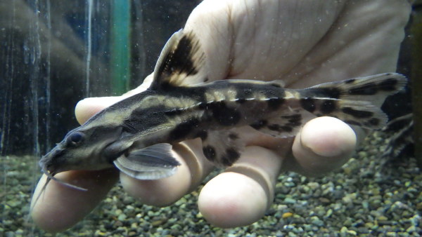 違いがわかりますのでご安心下さい!他のナマズに混じってしか輸入されない希少なナマズです!成長につれて体色はビカビカのメタリックブルーになり背ビレはすごく長く伸びていきます!餌も人工飼料に簡単に餌付きますし、丈夫でキレイでカッコいい最高のナマズですよ!サイズも最大で25cm位なのでそんなに大きな水槽が準備できないという方でも飼いやすいですね!中段左の画像です。