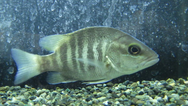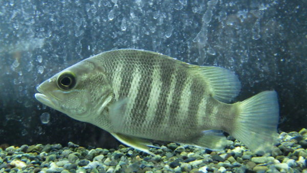 ウラウチフエダイの和名がある大型のフエダイの1種です。何年も入荷が途絶えていたのですが、今年になってぽつぽつと入荷が見られるようになりました。かなり高価な魚でしたがここへきてだいぶ値段も落ち着き、入手しやすくなりましたね。フエダイの1種ですがパプアンバスは純淡水での飼育も可能ですし、人工飼料にも簡単に餌付きますので飼いやすいですよ!大きくなるとガンメタっぽい濃い渋い体色になりすごい迫力がでます!!入荷したばかりでちょい痩せ気味ですがしばらく飼い込めばすぐに太ってきますのでご安心下さい!入荷は1匹のみ!大特価につきお見逃しなく!!中段の画像です。2つの画像は同一個体です。