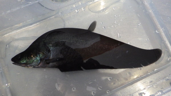 ボルネオブラックナイフです。アジアンナイフフィシュの中では個人的にはロピスが一番かっこいいと思います!!模様も無いし一見地味に見えるかもしれませんが、その黒い体は紫や青、緑に光りすごくキレイなんです!今年は入荷がちょっと多めな感じですが、滅多に入荷しない希少種で年間を通して1匹も入荷がないということもあります。なのでまた次がいつになるかは分かりません!毎回入荷してすぐ売り切れてしまいますので、ご興味のある方はお早めに!!左上の画像です。