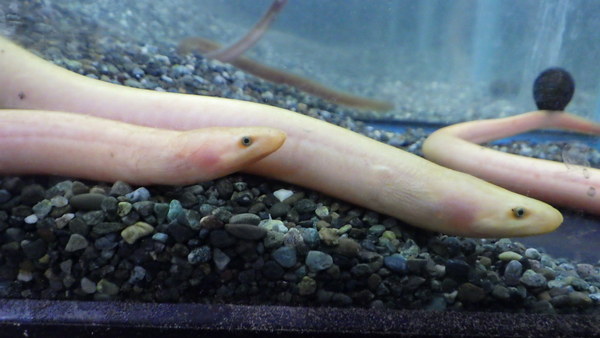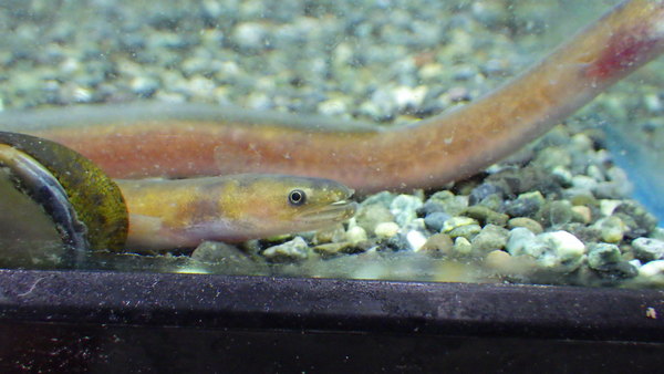 インド産のシラスウナギということで入荷しましたが、水槽入れてよく見たらどうやらウミヘビの1種のようです。種類は分かりませんが、ホタテウミヘビ?ゴマホタテウミヘビ?まぁその辺の種類だろうと思います。純淡水でも飼える面白い魚ですよ。水槽入れるとすぐどこかに隠れてしまい、飼ってることを忘れてしまいがちですが、たまに出てきた時にちょっと大きくなてたりすると楽しいんですよね!?左下の画像です。