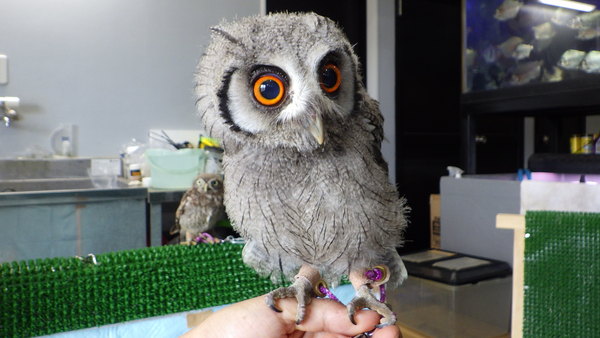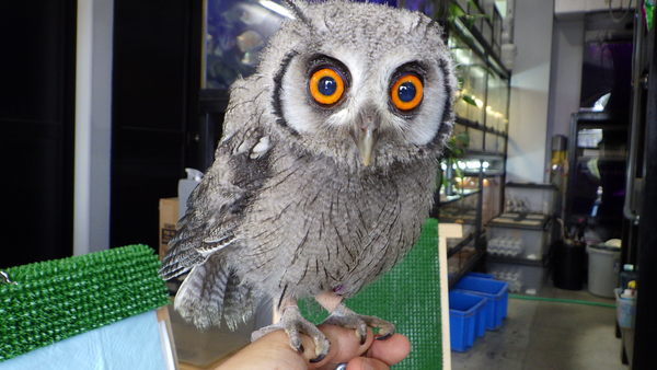 人気のアフコノが入荷!うっすらと綿毛の残るヒナ上がりの若鳥です。まだ入荷したばかりで少々落ち着かないところもありますが、良く馴れた個体で状態も良好です!!オレンジのまん丸の目に耳のような飾り羽がチャームポイントで、フクロウの中でも特に人気の高い種類でオススメです!