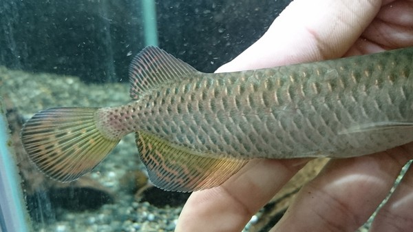 オルナティピンニスも入荷しましたが状態が良くないです。元気は元気なんですが、体側に何やら嫌な感じのデキモノが・・・。スネークヘッドに関してはこういうのが致命傷になりかねないんですよね、いきなり死んだりしますから・・・。とりあえず薬浴してトリートメントします。キレイに治ってくれたら販売しますので、その時はまたご紹介します。