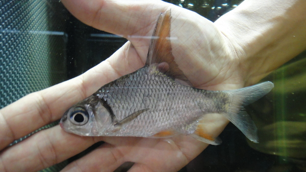 ピースカンって実はPuntioplites属の背ビレが高くなるバルブの仲間のことで、ピースカンとかハイフィンバルブの名前で何種類かが区別されることなく流通します。タイとかミャンマーから来るやつに限って言えば2~3種類に限定されるんですが、どれがどの種類なのかは正直微妙・・・。その上もともと滅多に流通しない魚だから目にする機会もほとんど無くて誰も細かいことをつっこまないんですよね・・・。そんなピースカンですが、今回1匹だけヒレが赤い明らかに他のと違うやつが輸入されました!顔付もちょっと違っていて他のよりもさらに丸い顔をしています!これは変わってるしキレイになりそうだから超オススメです!!右下の画像です。
