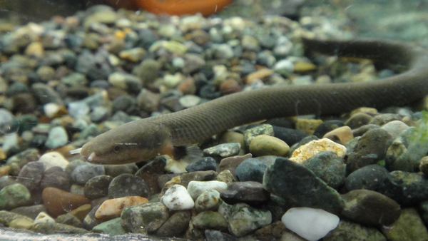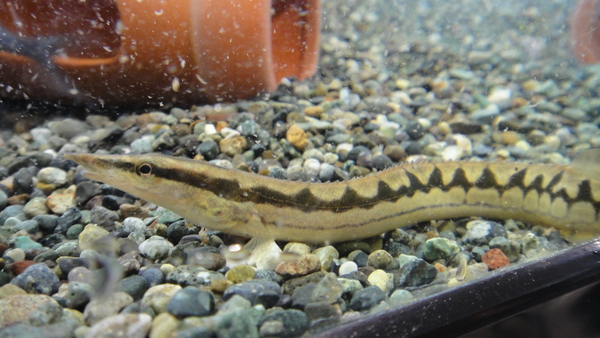 ヤマウツボとも呼ばれる終生純淡水で飼育が可能な淡水ウツボです。このヤマウツボ以外の淡水ウツボは海水性のウツボの幼魚を汽水で飼ってるだけで、本当の意味での淡水ウツボではありませんので要注意ですし、そういう種類は最終的に海水が必要になる種類がほとんどですからね。このヤマウツボに関しては全くの純淡水でOKで、pHを高く保つ必要もありません。普通の熱帯魚を飼う感覚で飼育が可能です。餌も生きた小魚や赤虫などの生餌を好みますが、人工飼料にも餌付きますのですごく飼い易いです!模様もキレイで超オススメです!この位のサイズでも普通は2万円とかすることが多いのでこの値段はかなりお買い得ですよ!中段右の画像です。