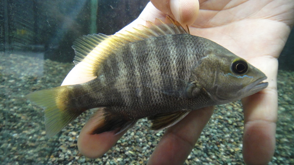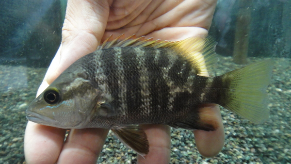 もう10年位前になると思いますが、過去に1度入荷したことがありました。その時のはもっと大きくて(20cm位かな?)体色もガンメタな感じでパプアンバスの特徴がはっきり出ていた個体だった記憶がありますが、今回はその時以来、本当に10年ぶり位の入荷になります!最近になって少数が輸入されていたのは知っていましたが、値段が高くて仕入れを躊躇していたのですが、今回かなりお手頃な値段で輸入されたので迷わずゲットしました!釣りの対象魚としても有名な魚で、ガンメタの体色がかっこいい大型のフエダイです。成魚は海で産卵して稚魚の間は海や河口の汽水域で過ごすらしく、ある程度のサイズになると純淡水ると域で生活するそうです。なので入荷した位のサイズでは純淡水での飼育が可能です。日本でも西表で生息が確認されており、ウラウチフエダイという和名もあります。沖縄の知り合いに採れないか確認したこともありましたが、沖縄での捕獲例はかなり少ないそうです。モンスターフィッシュマニアの方、次回入荷は未定です!入荷は1匹のみですが大特価ですのでお見逃しなく!!23日追記:すいません、画像準備する前に売れてしまいましたが、一応画像アップしておきます。上段の画像です。2つの画像は同一個体です。