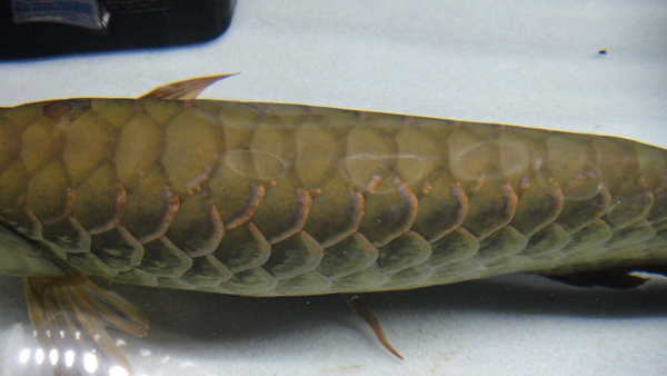 これも下取りにつき大特価です!インドネシアミトラ産のグリーンアロワナです。混泳によるヒレのバラけが少し見られますが、しばらくで問題無く治る程度です。目垂れ、アゴズレ、エラ捲れもありませんので、ヒレが治れば完品になる個体です。画像では分かりにくいかもしれませんが、グリーンにしては各ヒレも大きめでスタイルも良くてカッコいいですよ!ベビーで買ってもこれより全然高いですからね、このサイズでこの値段は絶対にお買い得です!お見逃しなく!!下段の画像です。