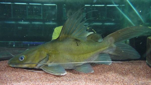 これすごいですよ!アフリカのバグルスフィラメントーサスはたまに輸入されてるからナマズマニアの方なら知ってる方も多いと思いますが、今回ご紹介するのはそれとは違うフィラメント伸びちゃう系のバグルスで、タイとか東南アジアに生息するヘミバグルスフィラメントスです!しかもそれの超キレイなショートボディ!!ノーマル体型の個体であっても過去に国内に輸入があったかは微妙。もしあったとしても多分イエローミスタスとか他のナマズに混じって来てたことがあったかもしれない位だと思いますのでかなりの希少種だと思います。ショートボディに興味のない方もいらっしゃるかと思いますので、これがノーマルボディだったら欲しかったという方も多いかもしれませんが、すいません、今回はこのショート個体1匹しか発見できませんでした。でも現地でも単独で大事にストックされていただけあって魚の状態、クオリティは抜群です!欠点や不自然な歪みの無いパーフェクトなショートで、デフォルメされた戦闘機みたいな形です!?現地で見た時は真っ黒でしたが、当店の水槽では明るいオリーブグリーンに発色してとてもキレイです!ショートマニア、ナマズマニアは必見です!!こんなのもう2度とお目にかかれないと思いますよ!!上段の画像です。2つの画像は同一個体です。