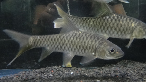 ボルネオ島の秘境より超レアなマハシールが入荷しました!インボイスはボルネオスーパーレッドマハシールでTor tambroides ”Borneo” の学名が付いてきました。タンブロイデスと聞くとタイから来るブルーフィンカープが頭に浮かびますが、調べてみるとタンブロイデスはタイ以外にもインドネシアやマレーシアなど東南アジア広域に分布しているようで、今回入荷したのはボルネオ島に生息する体色が赤くなる個体群らしいです。でも見た感じタイの青いブルーフィンカープと同種の魚には見えませんね・・・。現状はまだ20cm程ですから全然真っ赤とかではありませんが、うっすらヒレや頬がオレンジがかった赤茶色に発色していて、鱗もやや茶色がかっています。お店では黒水槽に入れてしまったので画像では黒ずんだ感じに写ってしまっていますが・・・。tor tambroidesで画像検索してみてください。大型個体の現地写真や赤く発色した個体の画像が見られますよ。かなり激レアなトールで、輸入元の話ではこの産地からのタンブロイデスは初入荷ではないかとのこと。在庫は少数のみです!マニアの方はお見逃しなく!!上段の画像です。