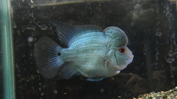 タイシルクとも呼ばれる一切模様の入らない真っ青なフラワーホーンです。少し前まではこの品種のビッグヘッドって滅多に入って来ませんでした。いてもものすごく高価だったりしましたが、最近はそこそこ輸入されるようになったみたいで値段もだいぶ落ち着いてきましたね。それでもまだまだ他の品種のビッグヘッドに比べると流通量は少ないように思います。キレイでしっかり頭の出た良個体です!超オススメ!!左下の画像です。