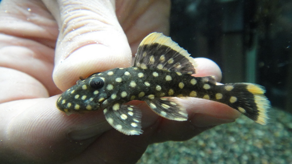平べったい体型と細かい青白いスポットが特徴のかっこいいプレコです。大型個体は胸ビレの棘が発達してすごく迫力あります!右下の画像です。