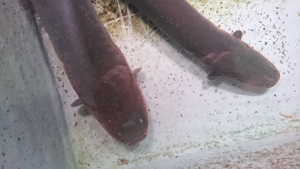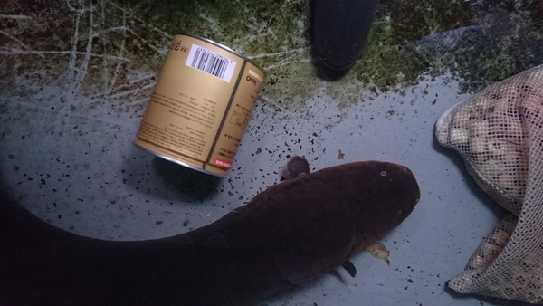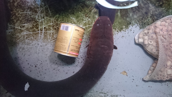 超極太な巨大デンキウナギが入荷です!頭の大きさがクリルの缶より全然大きいです!こんなのに感電させられたら死んじゃうかも!?一般の家庭よりも水族館とかそういう施設向きの魚かもしれませんね!?というわけで水族館の関係者の方、いかがですか??こんなサイズだともし輸入して仕入れたらとんでもない価格になてしまいますが、今回は国内で大きく育てられた飼い込み個体の為かなりお買い得です!もしご興味のある方はお問い合わせ下さい。ただし大きすぎて発送はできませんので取りに来れる方でお願いします。売れなかったら(まぁこんなの売れないでしょうね・・・。)お店のペットですね!?画像では全然大きさが伝わらないのが残念ですが、上段の画像です。