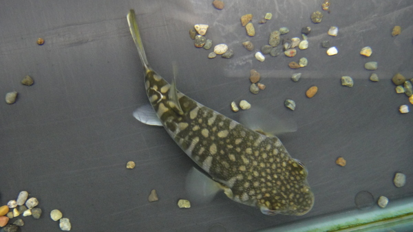 昨日のパストゥレイタスに続いて今日もフグが入荷です!インドゴールデンスポットブラックパファーのインボイスで入荷しましたが、まだ小さいからなのか、スポットの大きさは不均一ですね。過去に国内に輸入された大型個体のような真っ黒の背中に細かいゴールドスポットがびっしりといった表現になるにはもう少し飼い込んでサイズアップが必要なのかもしれませんね。淡水でもいけるらしいのですが、ほとんど輸入されていない情報の少ないフグでもあるので、何となく少し塩入れてみました。すごくキレイでかわいいフグです!超珍しいフグなのでマニアの方はお見逃しなく!!上段の画像です。2つの画像は同一個体です。