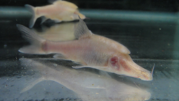 Sinocyclocheilus sp です。この属かなりの大所帯。50種ほどが記載されていますが中国では保護の対象のためほとんど輸入されることのない希少な魚です。以前にもこれの仲間が入荷しましたが、それは目がある種類でした。今回入荷したのは目が退化してしまった完全洞窟棲の種類です。今回入荷したような種類こそが洞窟魚のイメージにぴったりの魚だと思うんですが、見た目超キモいです!超キモくて超良いんです!!以前に入荷した目のあるやつも全然売れないでまだ在庫でいます、しかも2匹も・・・。だからたぶんこれも売れ残るんでしょうが、全然構いません!だってこんな深海魚みたいなキモい魚、売らずに趣味で飼っててもいいと思ってますから!?今回この目の無いのも2匹入荷してます。目のあるのもそうだったのですが、雌雄差なのか体型(体高)や体色がかなり違います。乳白色で体高のある個体とやや灰色っぽくて少し体高が低い個体といます。中国の研究施設では繁殖にも成功してるらしいので、せっかくなら2匹セットで繁殖狙ってみたいですね!?上段の画像です。左上が10cm位のちょっと灰色っぽい個体で、右上が12cm位の白っぽくて少し体高の高い個体です。