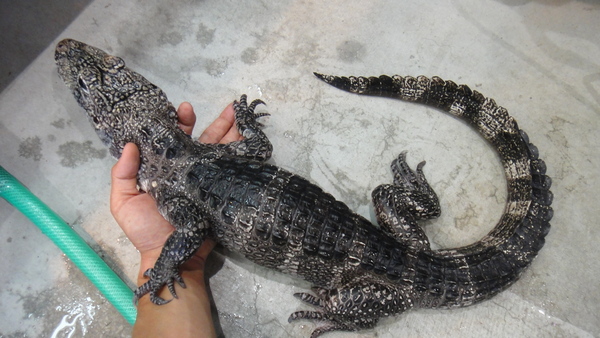 昔からワニが欲しくて憧れはあったのですが、やはり大型種や気性の荒い種類では在庫することにためらいもあり、自分で飼育、販売するなら絶対に小型で性格の大人しいヨウスコウワニだなと決めていました。ですがここ数年はパッタリと輸入がストップ。もう手に入らないかなと思っていましたが、今回は運よく手に入れることができました!9歳の個体ですがこのサイズ、全長で90cmしかありません。大型の施設で飼育すれば全長で140~150cmは狙えるかもしれませんが、それでもその程度です。普通に150~180の水槽で飼育していればおそらく最終的にも全長で100cmを超えるかどうかといった程度のサイズ感です。そして都市伝説のようにヨウスコウワニは大人しいと昔から言われてきましたが、これが本当に大人しくて普通に触れます。とは言ってもそこはワニ、万一噛まれたりすれば大ケガは必至ですのでハンドリングをすすめるわけではありません。ですがメンテナンスのことを考えれば性格は大人しい方がいいのは間違いありませんね。すでに9歳の個体ですが、ワニはとっても長寿な爬虫類です。50年位は生きますのでまだまだ長生きしてくれますよ!
