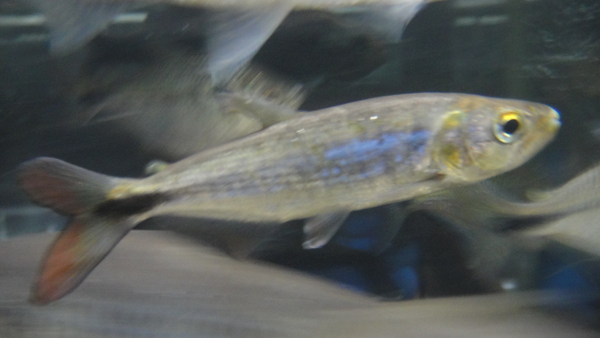 安い魚ですが入荷少なくて結構珍しいです。ヒレの赤いシルバーシャークみたいなカッコいいコイです。たまにしか来ませんのでいる時が買い時です!!左下の画像です。