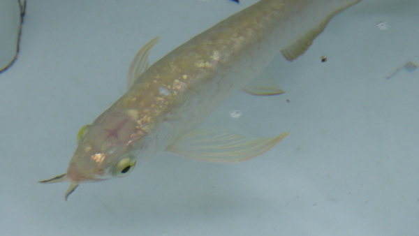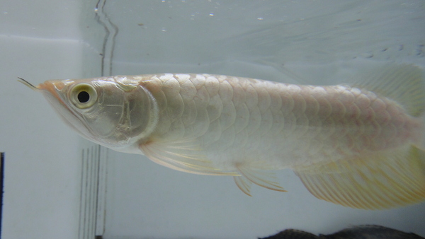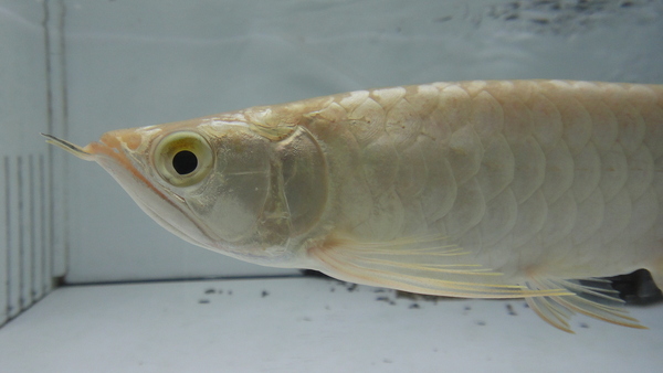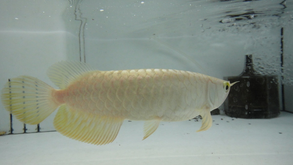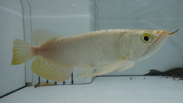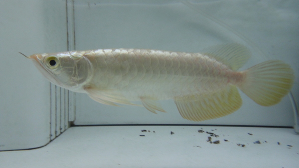 シンガポールのインペリアルアロワナファーム産の過背金龍です。白水槽でストックしているため現状では全く藍底な感じはしませんが、黒水槽で飼育すればキレイなブルーが発色します!頭の金もまだサイズが小さいのでわずかに光っている程度ですが、白い水槽でしっかり照明をあててあげれば頭の金の発色はこれからどんどん広がっていくでしょう!背中にも金のラメ状の発色が見られますので、将来性は間違いないと思います!黒水槽で藍底を楽しむか、白水槽でゴールデンヘッドを楽しむか悩んじゃいますね?!このレベルの個体がこの値段は超お買い得ですよ!