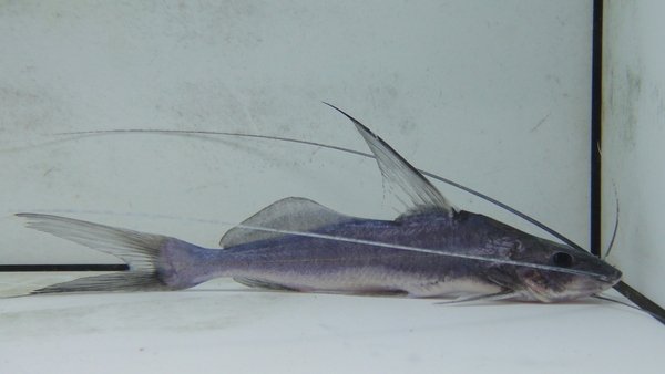 これ大好き!真っ青でビカビカの体色がすごくキレイ!背ビレが長く尖り、顔付きも精悍でシルエットも超カッコいいです!餌は人工飼料に簡単に餌付き、こんな見た目なのに生き餌とかはほとんど食べません。なので小さいサイズの魚とも混泳が可能です。最大で30cm位なのでそんなに大きな水槽じゃなくても終生飼育が可能です!他のナマズに混じって輸入される程度で、滅多に入ってきませんので欲しかった方はお見逃しなく!入荷したのは2匹のみです!中段右、左下の画像です。2つの画像は同一個体です。
