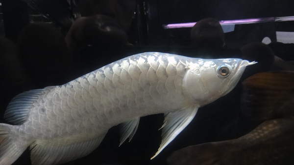 背中曲がってます・・・。発色の良い個体なので残念です。頭には金の筋が入り、このサイズですでに6列目が光って一部巻いてます。顔つきもかっこいいので本当にもったいない!餌食いとかは問題ありませんので、混泳用とかにいかがですか?上段と中段左の画像です。