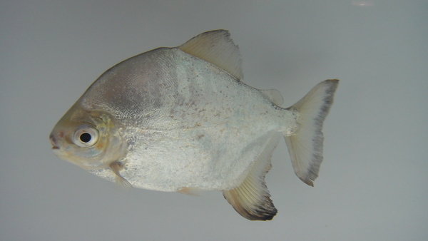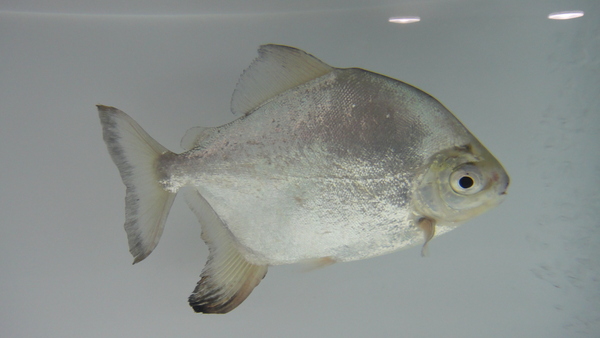 超激レアパクー入荷!スーパーホワイトパクーのインボイスで入荷しましたが、アクノドンのようなやや下向きの口をした面白いパクーですね。輸入元の話ではほとんど流通していない種類だそうで、おそらく今までに国内に輸入された個体は数匹程度ではないかとのことです。現状では白っぽい銀色の体色に背中の方だけうっすらバンドが入る感じですが、クリアのベアタンクや白い水槽で飼育すると、スーパーホワイトの名前の通り、プラチナ個体のように真っ白になるらしいです!ちょっと興味があるのでとりあえず白水槽に入れてみました!売れ残ったら体色の変化の具合をいろいろ試してみたいですね!もちろん入荷はこの1匹だけです!問屋さんにもこの1匹だけしかいませんでしたので超貴重です!安い魚ではありませんが、サイズを考えればかなりお買い得だと思いますよ!!中段の画像です。2つの画像は同一個体です。