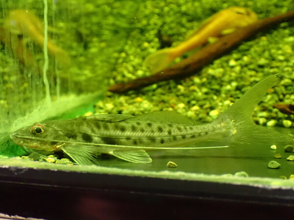 前はいつも売れ残って店でどんどんデカくなってしまうような悲しいナマズでしたが、最近はあまり売れ残ることもなくけっこうすぐに売れるようになった気がします。やっとみんながこのナマズの魅力に気が付いてくれたのかもしれません。かっこいいしキレイだし、何でも食べて丈夫だしす、ごく良いナマズだと思うのでもっと人気あっても良いと思うんですよね。唯一欠点をあげるとすれば餌食いが良すぎることくらいだと思いますからね。右下の画像です。7日追記:一緒に入れてたスネークヘッドに噛まれてしまいました・・・。すぐに分けたので数日でキレイに治ると思いますが、とりあえずしばらくトリートメントしてから販売しようと思います。