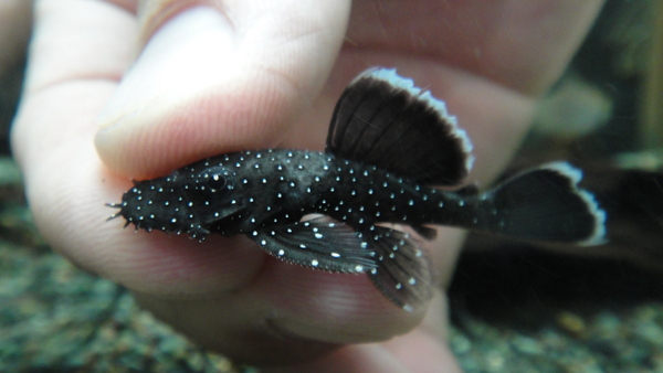 人気のホワイトエッジブッシーが入荷!サイズも小さめなので値段もお手頃です!細かい水色がかったホワイトスポットに背ビレの太いエッジが目立ちますね!ブッシープレコですからコケも食べてくれますよ!左下の画像です。