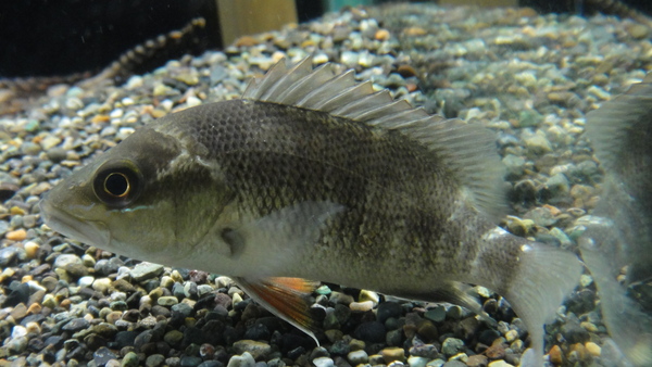 ニューギニア産のフエダイの1種です。モンスターフィッシュマニアの方や釣り好きの方でしたら、ニューギニア産のフエダイと言えば思い浮かべる魚は1つしかないと思います。もちろんパプアンバスですよね!もしかしてパプアンバスの小さいのだったらいいなぁと思い問屋さんにいたの全部仕入れちゃいました!でもこのサイズのパプアンバスなんて見たことないので、こいつの正体は分かりません・・・。魚力がオープンして10年以上たちますが、過去に1度だけパプアンバスが入荷したことがありました。そいつは20cm以上あって、体色はガンメタで体型や体の厚みはもうイメージ通りのパプアンバスのミニチュアみたいな感じでしたね。今回のは10cmもないのでこれからどんな感じに育つのかはわかりませんが、気分によっては体色を黒化させたりして、そんな時はけっこうそれっぽい感じにも見えますね。現在は純淡水でストックしておりますが全然普通で特に問題は無さそうです。気になる方は育ててみてください!!4匹入荷しましたがホームページにアップする前に1匹売約となりましたので残りは3匹です!お急ぎください!!下段の画像です。気分によってかなり体色を変化させます。