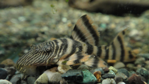 個人的にはすごく好きなんですけどね、イマイチ人気がないのかあまり売れないんですよね・・・。タイガープレコの仲間の中でもかなりキレイな種類だと思います。体色は白っぽいクリーム色にこげ茶色のバンドで、頭には細かいラビリンス模様が入ります。いつでもいるような魚ではありませんので、いる時が買い時ですよ!右下の画像です。