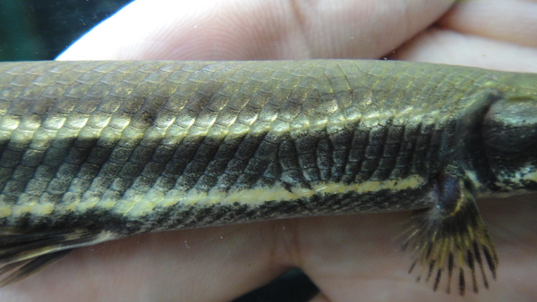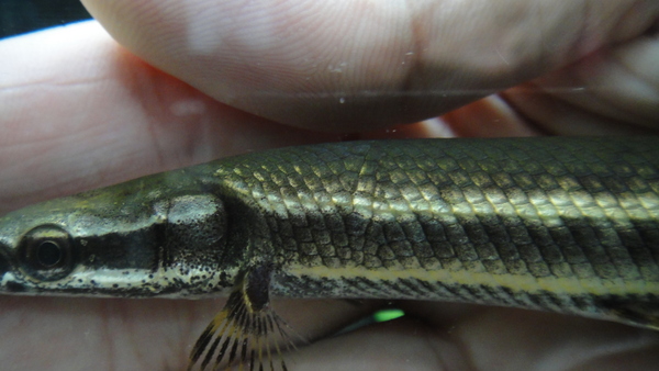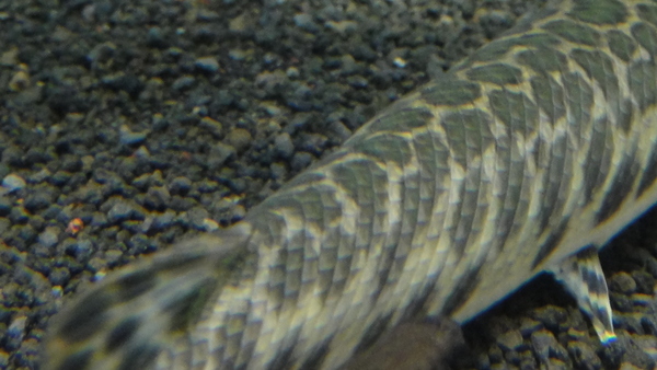 8月25日に14cm位で入荷した個体ですが、これも毎日しっかり餌を与えておりましたのでぐんぐん成長してます!今では30cm近くありますよ!この個体は入荷した時からわずかに背中に違和感がありましたので、売らずに様子を見ていました。背中の一部(左後方部)に小さな凹みがあったのですが、成長するにつれてほとんどわからなくなりました。現状では言わなければ全然気が付かないと思いますし、言ってもわからないかも??背中や体側のスポットもキレイだし、吻も長くてすごくワイルドらしい個体です!これからさらに大きくなれば完全に治ってしまう可能性もありますので、この値段はかなりお買い得だともいますよ!このサイズのワイルドのスポガーなら普通4~5万位はすると思いますよ!多分画像ではほとんど分からないとは思いますが、凹み部分の画像をアップしますのでご確認ください。