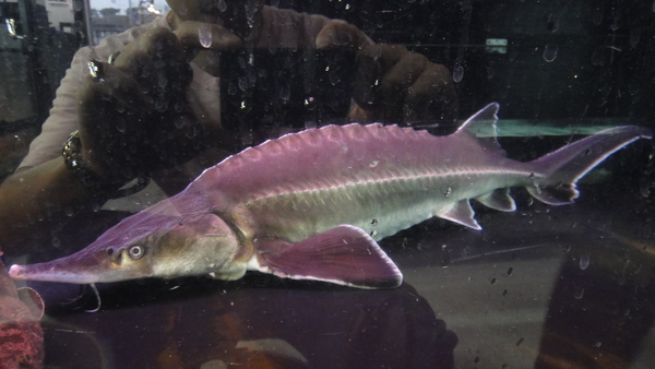 完品のキレイな個体です!昨日の夕方に常連のお客様から50cm位のベステルを買い取って欲しいとのご連絡をいただきOKしたのですが、持ってきてもらったら全然50cmじゃなかったです。測ったら67cmもありました!正直デカすぎて困ってます・・・。現状1200×600の水槽に入ってもらっていますがかなり狭そう・・・。店にはもっと大きい水槽もあるのですが、そこは水温が30℃以上あるのでチョウザメにはちょっとキツそうだし・・・。というわけで、早く買い手を探したいので特価で販売します!どなたかよろしくお願いします!!せっかく完品でキレイな個体なのにこのままでは鼻をぶつけてしまうのも時間の問題・・・。このサイズですから発送は無理です!今日中に取りに来ていただける方でしたらさらに値引きさせていただきます!ちなみに水温は27℃でキープしています。もともと飼われていたお客様のお宅でも27℃位で飼われていたそうなので極端に水温が低くなくても大丈夫ですよ!こんなサイズのチョウザメがこんな値段で買えるなんてもうないですよ!