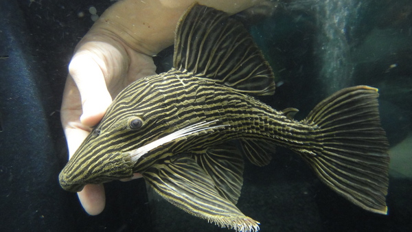これは全然新入荷じゃないんです。新入荷どころか半年以上売れ残ってる長期在庫個体なんです・・・。でも最近すごいことになてきたのでアップしてみました。見てください、このヒゲボーボーの頬と厳つい胸ビレの棘を!ヤマアラシみたいです!!入荷した時はこんなんじゃなかったんですが、飼い込んでたらこうなりました。たぶんあと2~3か月位(長いと半年以上)で頬の棘は抜けますが、また時期がきたらボーボーに生えてきます!なので抜けてもがっかりしないでください!オスでもみんながここまでボーボーになるわけではありません!このクラスは当たり個体です!こういう個体は、生える時は毎回こんな感じでボーボーになりますので、抜けても次のシーズンが楽しみになりますね!長期飼い込み個体に付き状態も良好で、餌も人工飼料をバクバク食べてます!色もキンキンですごくキレイですよ!