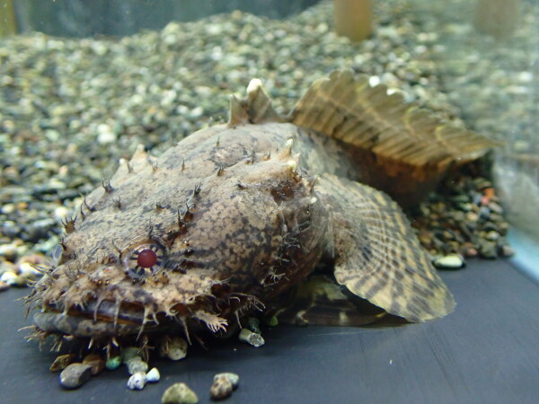スマトラ産のガマアンコウです。現地から純淡水で来てます。なので店頭でも純淡水でストックしていますが状態は良好です。淡水アンコウはベトナム産のが最近はよく来てて、あとはすごくたまにインド産が来たりですが、スマトラ産はそのインド産よりもさらに全然レアです。入荷は1匹のみですのでマニアの方はお見逃しなく!左上の画像です。