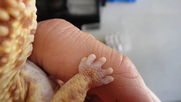 大きくて立派な個体ですが、残念なことに小さい時の脱皮不全の影響で爪がほとんどありません。指も何本か短くなっています。でも状態は良好で良く太っていますので飼育する上ではなんの問題もありません。爪がチクチクする感じも無いのでハンドリングはむしろしやすいかもしれませんね!?ブリブリですごくカワイイので、ハンドリング用の抱きトカゲにいかがですか??上段、中段左の画像です。
